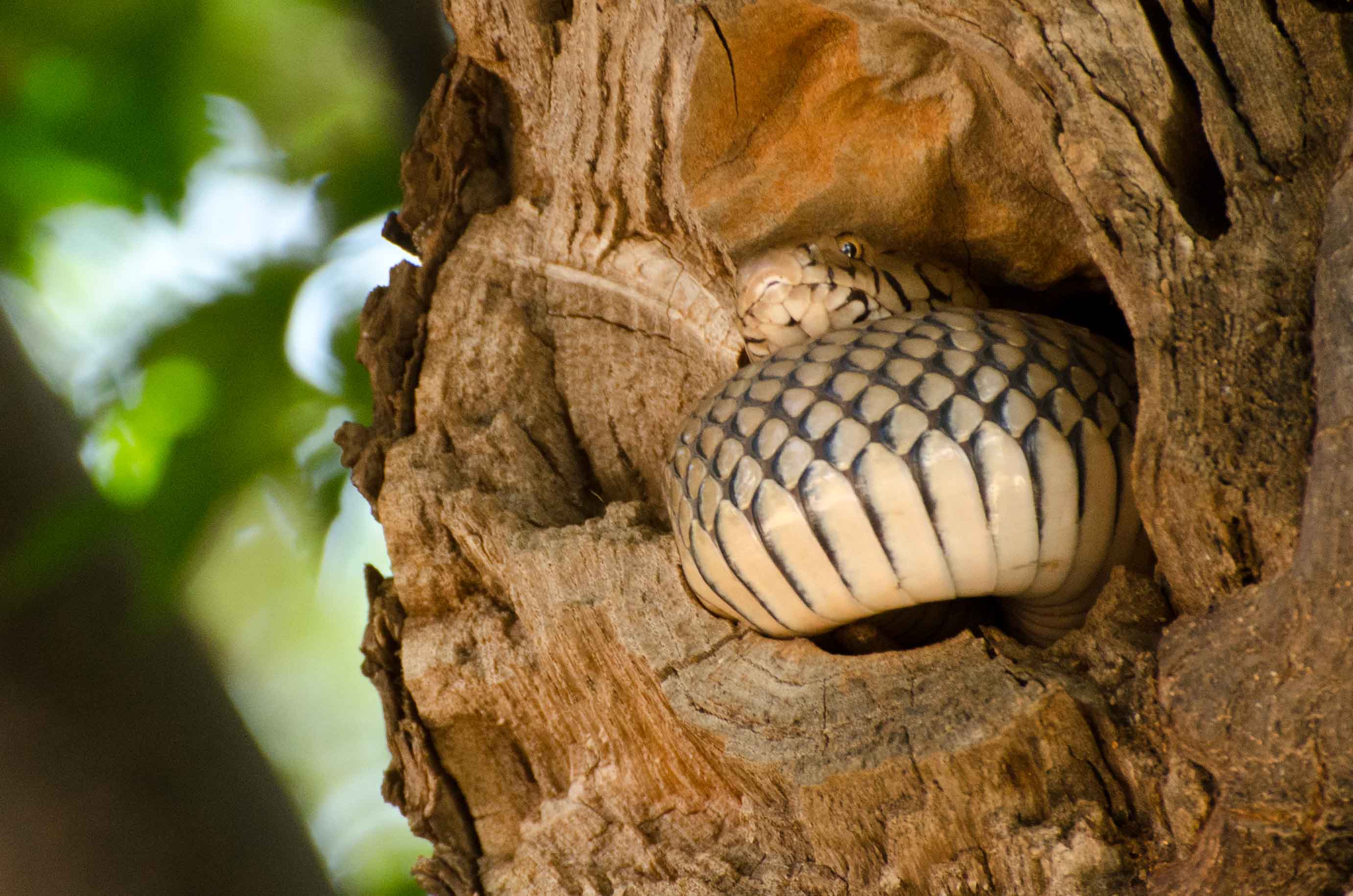 There, in the opening of a hollow about eight feet from the ground, sat an enormous snake. Only a small portion of its mid section was visible, but its girth clearly marked it out as a very sizeable reptile indeed. With the aid of quickly retrieved binoculars we could see its black beady eyes calmly surveying the scene.